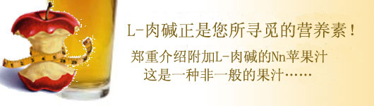 7) 请问市面上一般售卖的苹果汁与附加L-肉碱的苹果汁饮品有何差别? 市面上一般的苹果汁与附加L-肉碱的Nn苹果汁饮品是无法作比较的。L- 肉碱是一种可将脂肪化成能量的活性成份,可维护我们的心脏功能。苹果口味添加饮用L-肉碱时能拥有另一番滋味。