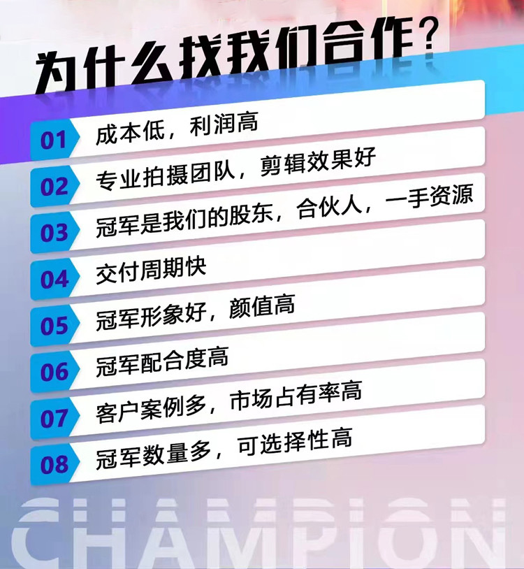 体育明星可使用肖像权,姓名权,拍摄小视频贺词/代言视频/现场参加年会/招商会/发布会等活动造势。冠军不仅是一种荣誉,更代表一种品质,即领先、突破与追求极致;冠军不仅是一个名词,更是一种精神,代表了不断超越、坚韧不拔。冠军代言已成趋势,这是为品牌赋能的最佳机会!