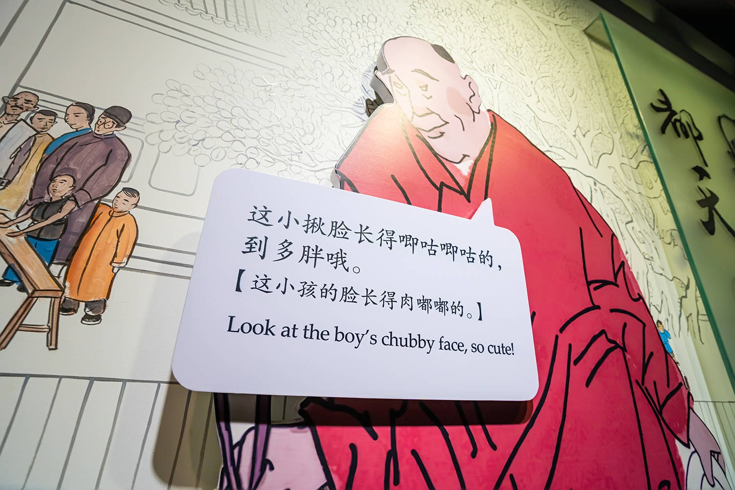 穿过古街则来到了淮安庙会的展示区,在一侧的对话板上,有一些有趣的淮安俚语,只要触碰一下展板对话框,庙会人物就会讲出又土又有趣的淮安方言,真的太好玩了。