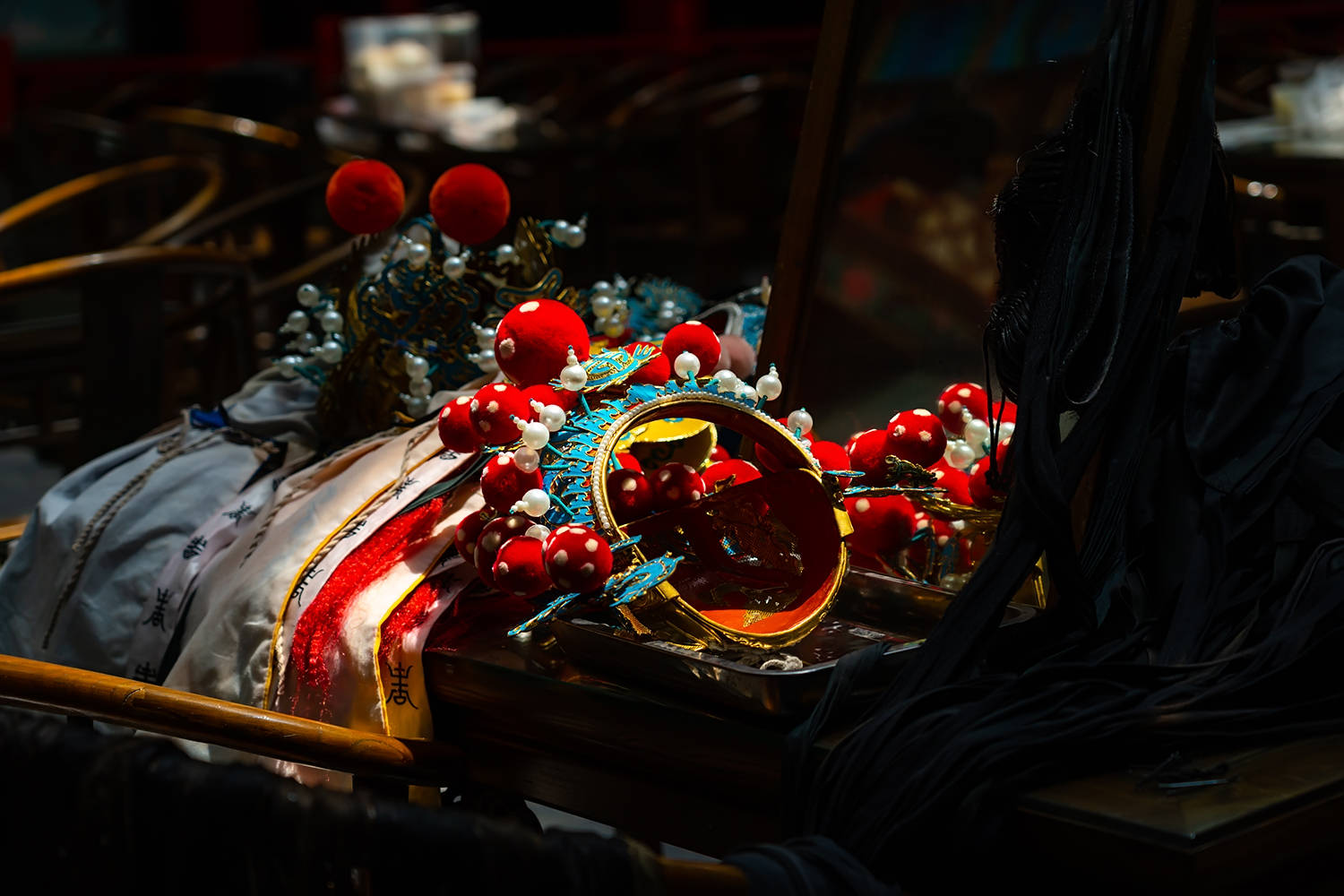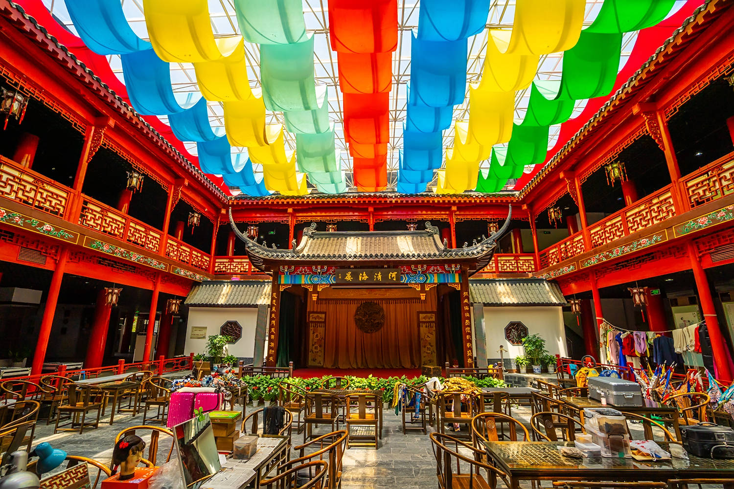 一进来最震撼的就是这个古戏台,五颜六色的旗子下舞台显得格外梦幻。因为没有演出,一旁稀稀拉拉散落着演员们的道具。这里也是经常会举行一些戏曲表演的活动,先后接待过国家、省多位领导同志,并成为戏曲票友交流、单位联欢的场所。