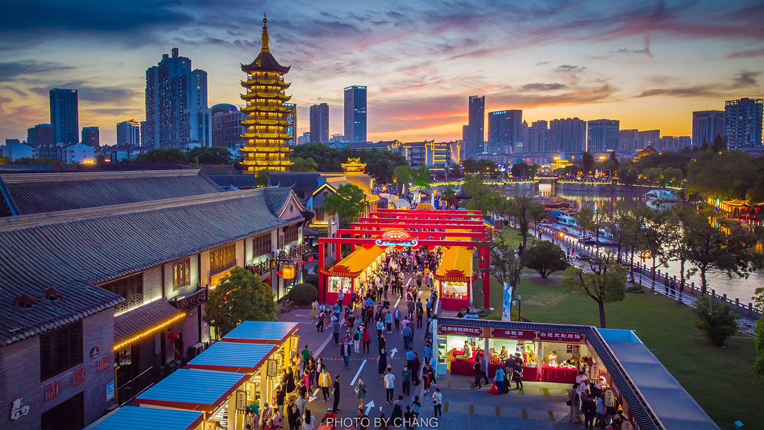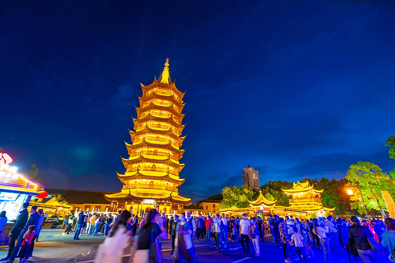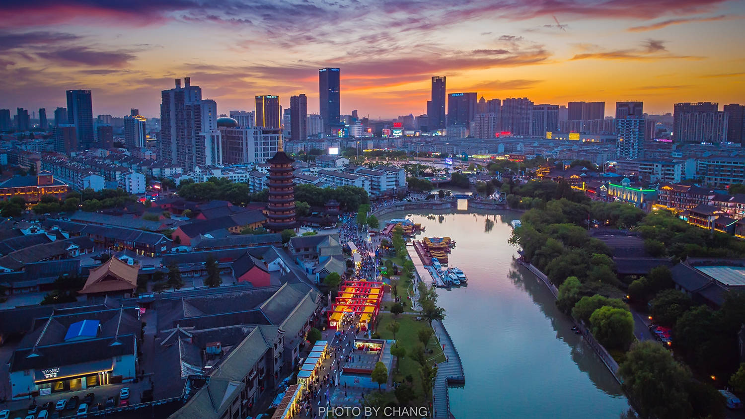 当夜幕降临,淮安清江浦的美才刚刚开始,绚烂的晚霞映照整个天空,仿佛给一切都披上了美好的颜色,此时此刻的非遗文化展也到达了高潮。灯火璀璨,国师塔的灯也亮起。