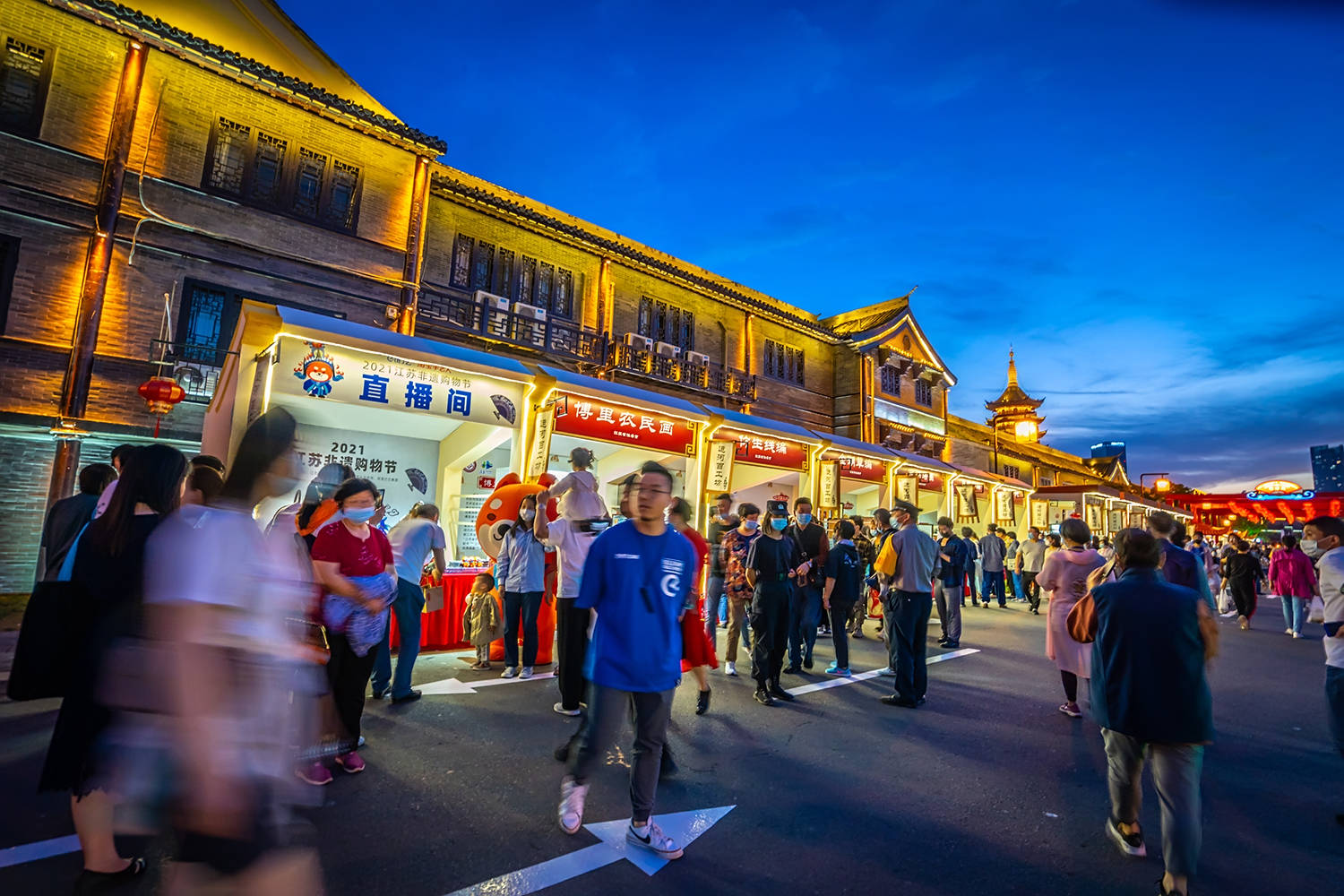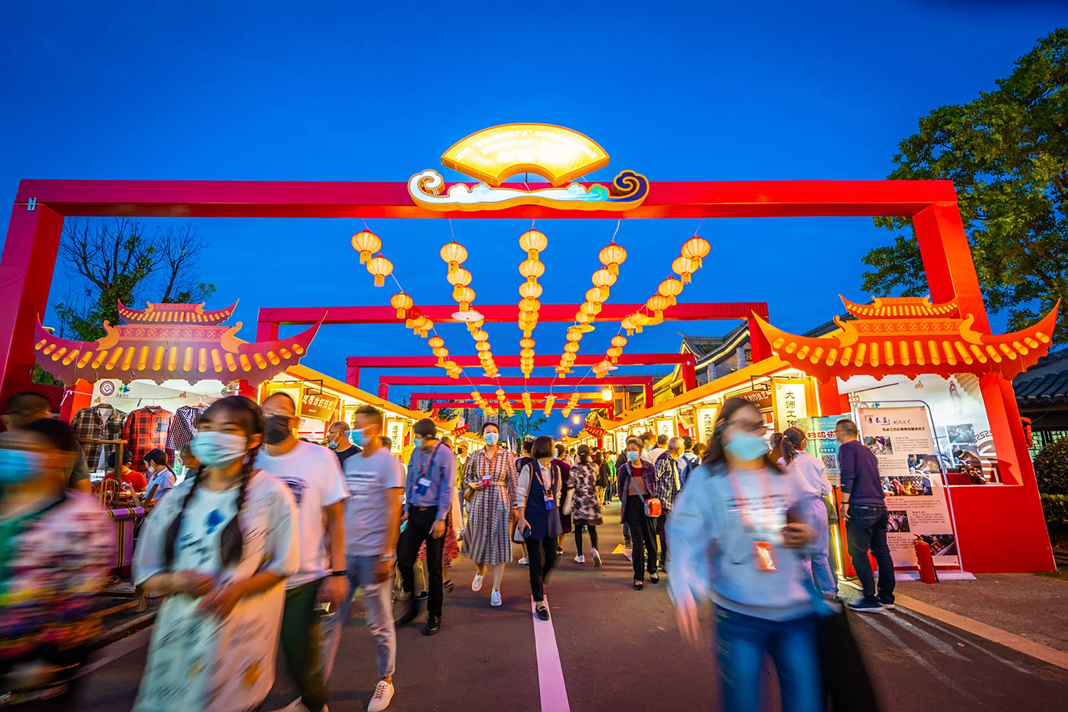 熙熙攘攘的游人都为一睹这盛大的运河非遗展,夜空变成深蓝色,展会上的红灯笼此时此刻显得格外的热闹美好,欢迎着来自五湖四海的游客们,共赏这一次全国瞩目的文化盛会。