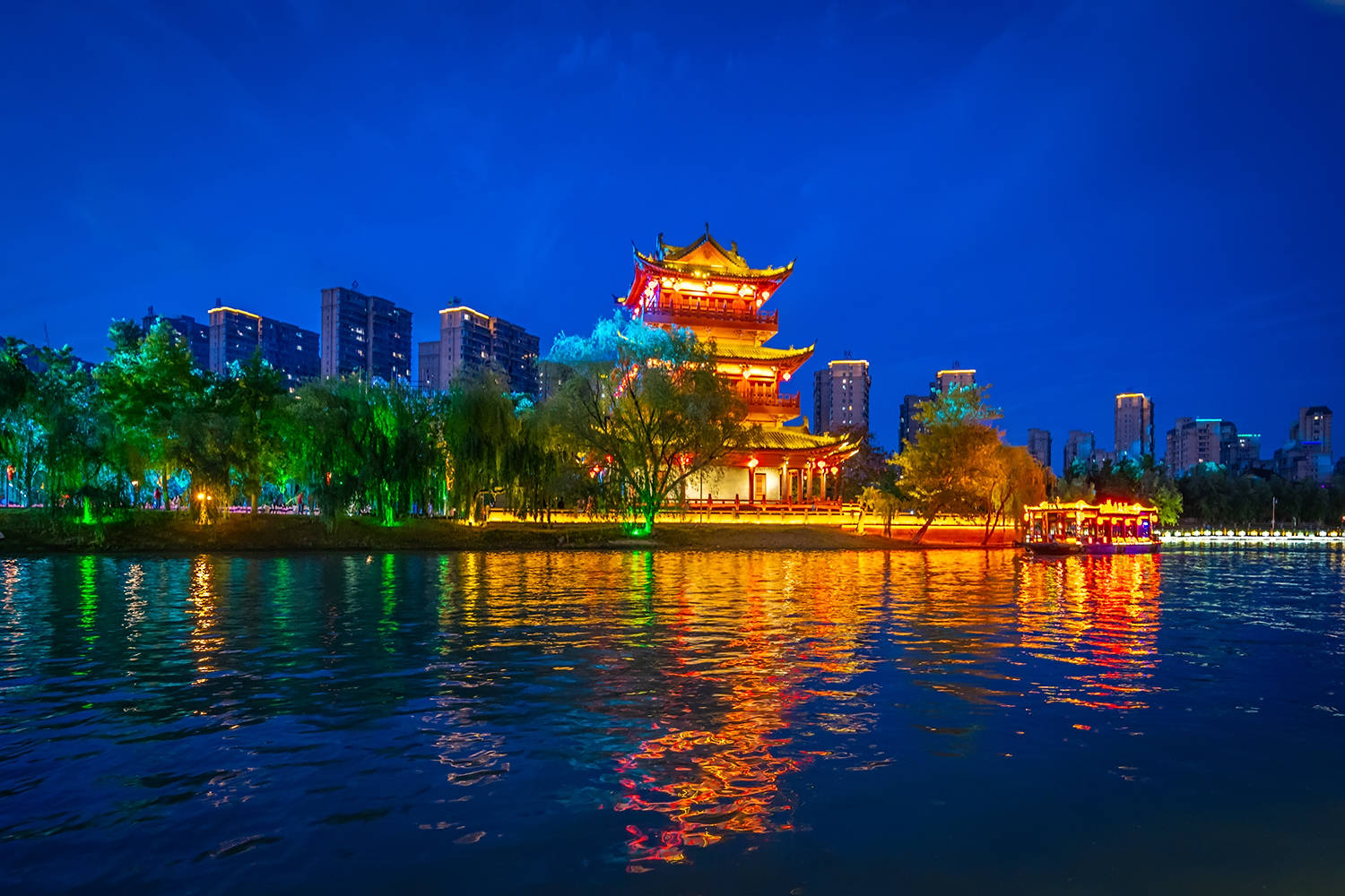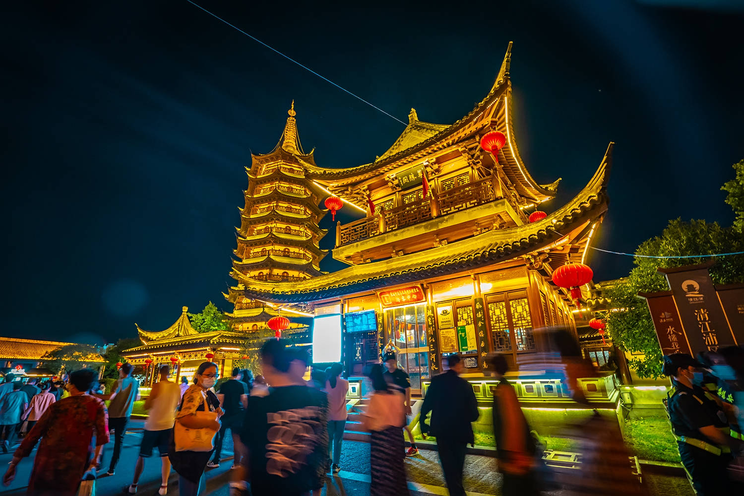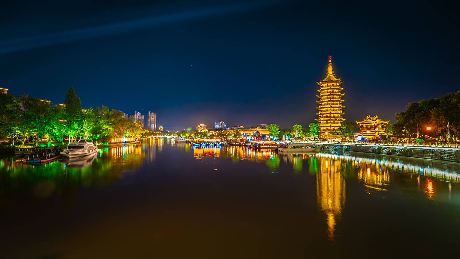 清江浦楼前游船优哉游哉,国师塔下人群摩肩接踵,运河两岸的建筑们纷纷亮起了好看的灯火,倒映在运河里宛如油画一般,比白天里显得更美更有味道了。